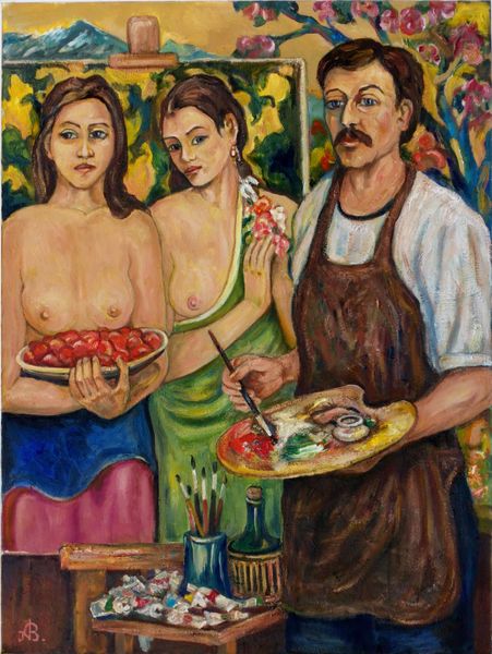 Andrey Allakhverdov’s oil on canvas, Boris Kustodiev, presents a scene alive with layered processes. It’s an artist's studio, maybe Allakhverdov's own, complete with model, tubes of paint, and a painting within a painting. The artist, palette in hand, becomes part of his own composition. The colours here are earthy but intensified. Look at how the cool blues and greens contrast with the warm flesh tones and the bright reds on the table. The texture is palpable, with visible brushstrokes that create a sense of immediacy. Notice the thick impasto of the paint on the palette itself. It's like the artist has captured a moment in time, but also the entire history of painting. I'm reminded of early self-portraits by artists like Courbet, or even later examples by someone like Philip Guston. It's that sense of the artist wrestling with their own image, their own process. There's a conversation happening here, a kind of back-and-forth between the painter, the subject, and the very act of painting itself. In the end it's a painting of art, of life, and of everything in between.
