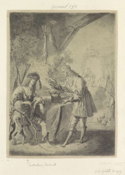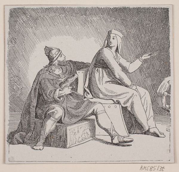 Curator: This pencil drawing, currently housed here at the Rijksmuseum, is entitled "Lot and One of his Daughters" by Jan Swart van Groningen, dating from 1530 to 1535. Editor: Initially, I am struck by the contrasting textures. Look at the smooth skin of the daughter versus the gnarled bark of the tree, all rendered in the limited tonal range of pencil. There's a powerful simplicity in the composition. Curator: Yes, and those contrasting textures amplify the figures’ symbolic meanings. Jan Swart is drawing upon a story freighted with symbolic weight. The daughter's relative youth and exposed skin contrast sharply with Lot’s patriarchal beard and concerned gesture, as he proffers the plate. Do you pick up any possible inferences of incest? Editor: The plate does lend itself to speculation about its contents and, indeed, it might imply that he’s holding a vial filled with the beverage to lower his awareness. I observe, however, the expert application of hatching and cross-hatching which delineates the rounded form of his arm. And is that a turban to the side of his feet? Curator: The turban functions as an emblem. We should remember the historical context. Lot’s narrative was very much about rejecting eastern corruption in favour of covenant and custom. His family needed refuge. So that turban on the floor implies those themes were prevalent during the Northern Renaissance. Editor: Interesting that you point to historical interpretation, as structurally, the piece does evoke an implicit dichotomy. It also seems there is very little interplay, however. She, after all, has bare feet and her garment and headdress indicate she already anticipates corruption and incestuous behaviors. Curator: The positioning of her hand on her dress indeed suggests acquiescence, perhaps resignation. The story and Jan Swart’s drawing are grim reminders that sacred beliefs can get warped by patriarchal corruption. Editor: But that rendering in pencil also means it's mutable. It suggests it can easily be rubbed out and started afresh—a narrative constantly rewritten and reinterpreted. The artist shows it could just all be imagination, sketched and ephemeral. Curator: Exactly. And like memory, always incomplete, partial, and interpreted. The brilliance here, is that Jan Swart gives us everything but asks us to bring our own convictions to the act of viewing, of meaning-making.