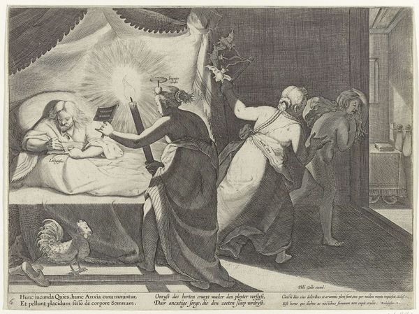 Editor: This engraving, "Miraculeuze genezing van een bedlegerige patient door de Heilige Hyacinthus van Polen" by Johann Sadeler I, dates back to between 1595 and 1600. The lines are so precise, and the scene has such a strong sense of both the earthly and divine. What historical context can we bring to its reading? Curator: This print invites us to consider the intersection of faith, gender, and power in the late 16th century. Here, a woman confined to her bed, powerless and presumably of some standing ("matrona" implies a married woman), is healed through the intervention of Saint Hyacinthus. How do you interpret the image in relation to the societal roles prescribed to women during that era? Editor: I suppose it emphasizes the reliance on the divine for health and well-being, especially when worldly remedies may have been limited. It positions women as vulnerable, but also as worthy of miracles. Curator: Exactly. And consider the Counter-Reformation context. Miracles were often highlighted to reaffirm the Catholic Church's authority. The print promotes a very specific power dynamic: the ailing woman's salvation comes not through her own agency but through male, divine intervention. This artwork reinforces the prevailing patriarchal structures, casting women as dependent on both religious and male authority. Editor: That's a darker reading than I initially considered. The miracle initially seemed like a message of hope, but it’s tied to social control. Curator: Precisely. Art often reflects and reinforces existing power structures. By examining the image through a feminist lens, we can unveil how it perpetuates certain ideologies. Consider too how visual rhetoric contributed to establishing early modern notions of gender, holiness, and sickness. Editor: Thank you; seeing it in light of social structures is powerful. I understand how faith, power, and the role of women intersect. Curator: I’m glad. Let's look at how Saint Hyacinthus is positioned...