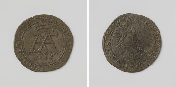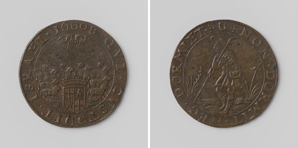 Curator: This unassuming medal, dating from 1650-1651, commemorates the payment of royal taxes on mills into the treasury of Brussels, with Jean Vander Tommen, a magistrate, named in connection to this act. What catches your eye about it? Editor: The stark imagery, almost brutalist despite its Baroque era association, intrigues me—windmill, water wheel, the crest, everything feels grounded, almost heavy, in its materiality. Is this the nature of tax? Curator: Perhaps! Consider its construction: made of metal, a very earthly substance. We are seeing here a tangible object representing abstract financial transactions and systems. Each side communicates meaning, yet both point towards systems of production. One side, as you note, pictures mills, instruments of industry. Editor: And the other with heraldry, signifying authority. There's an undeniable contrast, isn't there, between labor and the rewards from labor concentrated into the coffers? Is that cross an explicit endorsement? Curator: This medal served as a receipt, evidencing a transaction that moved material—grain ground at mills—into money. Look closely; the inscription circles the depictions; words forming a direct claim around image and action. Jean Vander Tommen and others produced coins. They likely benefitted. What statement do you suppose this made for those working in those mills at the time? Editor: Well, viewing from that historical distance and social standpoint adds complexity; I considered simply the stark visual of the images, overlooking class structure. We're invited, however subtly, to contemplate production, and, inevitably, the social strata linked inextricably to that labour. Even metal takes on a far heavier tone here when the labour to extract and the control to produce converge within. Curator: Indeed. Analyzing these intrinsic connections between imagery and socio-historical circumstance provides us an entry point. Editor: Thank you for directing my focus, in particular, toward a nuanced examination of those involved during production.