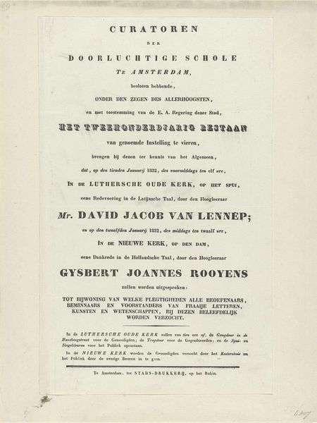 Editor: Here we have a prospectus printed by the Gebroeders van Arum between 1831 and 1832. It’s advertising two prints of the battles of Hasselt and Leuven, and it strikes me how the typography itself conveys a sense of formality and national pride. What do you see in this piece? Curator: What intrigues me most is its existence as a mass-produced object, a material artifact of Dutch nationalism. We must ask, who was consuming these images and for what purpose? The very act of printing and disseminating these images positions them not as unique works of art, but as commodities tied to specific social and political agendas. Notice the price; who could afford it? Editor: So you’re saying the print’s importance lies in its role as a form of propaganda? Curator: Precisely. Think about the materials: the paper, the ink, the printing press itself. All these elements speak to the infrastructure of knowledge production and the dissemination of nationalist ideology. Were these prints widely circulated, or were they mostly accessed by a specific, affluent demographic? Where were these images displayed? In homes, in public spaces, what purpose did they serve beyond simple documentation? Editor: That shifts my understanding from aesthetic appreciation to thinking about the print as a tool, a manufactured object that played a role in shaping public opinion. It’s interesting to consider how the production and consumption of such images contributed to the broader cultural and political landscape. Curator: Exactly. We need to investigate who controlled the means of production and what interests they served. These aren't just images; they're meticulously crafted instruments. Editor: I see, considering its cost. This helps to reconsider prints as products manufactured with great intentions, or, like you say, as instruments for disseminating knowledge to the interested groups. Curator: Well, I think there is so much to look at as cultural artefacts!