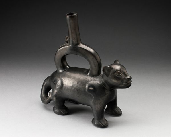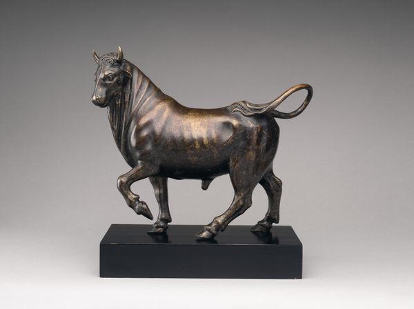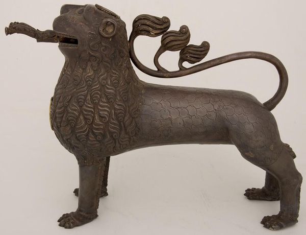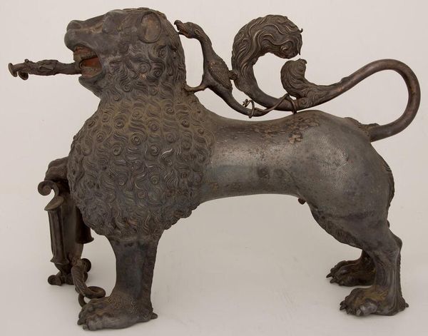 Editor: Here we have an aquamanile in the form of a lion, created around 1375-1400, in bronze, by Meester Bernhuser. The detail in the casting is incredible; look at the mane. What's fascinating to me is that it's so clearly functional as a vessel, but also this imposing, almost heraldic beast. What can you tell me about it? Curator: Let's think about the context. It's not *just* an object; it's a product of late medieval workshops. Consider the labor involved in mining the ore, the complex process of bronze casting using the lost-wax technique, and the skilled artisans who refined the mold and chased the details. Each stage is crucial. Where was this bronze sourced, and what trade networks facilitated its movement? These questions give a sense of the political and economic factors shaping artistic production. Editor: That's interesting. I hadn’t really thought about where the metal itself came from, just its function in a wealthy household. It’s clear someone put an immense amount of work into making the item. So, is this aquamanile then, a display of technological prowess, and therefore of social power, via materials and production? Curator: Precisely! The lion imagery conveys power, but it's also about displaying resources and skills. Bronze was a valuable material; a household owning this object wanted others to know the resources it took to make it. Moreover, objects like these blur boundaries. It is both functional and decorative, which prompts the questioning: Is it "high" art or craft? Ultimately, considering all aspects leads us to recognize the intense process behind this creation. Editor: I see, so focusing on materials and manufacturing helps to better understand the art's creation and what the maker was hoping to display by crafting the bronze lion. I'll remember to think about labor and context in artwork more moving forward. Thanks for your time! Curator: My pleasure. Considering production illuminates social relationships and material conditions embedded within art.