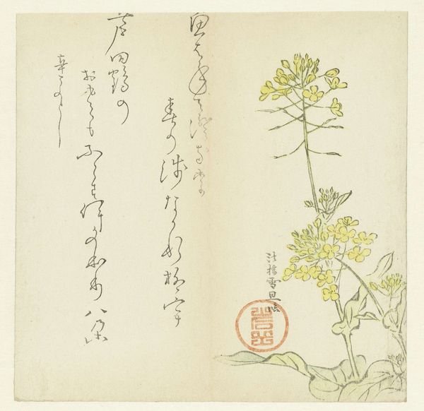 Curator: Here, we see Hasegawa Settan's "Pine Trees," a print from 1836 rendered in ink. Look at how spare it is. What are your immediate impressions? Editor: Austere. I mean, the palette is minimal—mostly off-white space punctuated by gentle greens and the muted reds of pine needles. The lines are so fine, it’s almost like a whisper on the page. Curator: Settan uses these delicate lines to bring to life a landscape. The poem inscribed balances the representational image on the right; consider how, from an activist perspective, that careful equilibrium itself speaks to a desire for societal harmony so deeply entrenched in Edo-period art and thought. Editor: The poem is essential, definitely, but also... it makes me feel things. I think the emotion stems from its brevity, its incompleteness as an image; the entire picture breathes this very acute longing. Do you see it too? Curator: Yes, but longing layered with a sense of social duty. We're moving into a period of unrest; an artist such as Settan, steeped in artistic tradition, finds himself having to represent more than simply a pretty picture. Trees are very often metaphors, symbols. Editor: True. The symbolism within East Asian art is multilayered. The pines could represent steadfastness or longevity. Bamboo also appears to frame the composition so it becomes hard to consider one without the other as powerful visual markers of resilience. Curator: I think this "Pine Trees" acts as a powerful yet subtle assertion of cultural values. The artist finds harmony between text and nature in a changing world. Settan uses these old elements of line and verse to convey an eternal message, and by referencing Japanese writing culture also acknowledges artistic skill. Editor: An invitation to viewers, perhaps, to seek resilience and harmony in their own lives? So look around now; go find a spot beneath a strong tree; go smell some pines and ponder this ancient yearning for rootedness and connection. Curator: Agreed. A call to listen to the quiet voices of our cultural ancestors, still whispering through the trees.