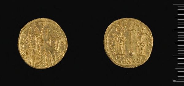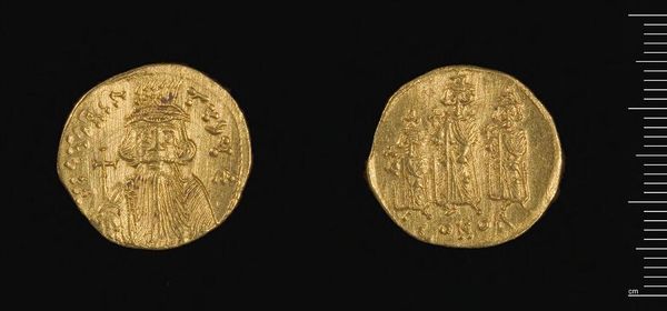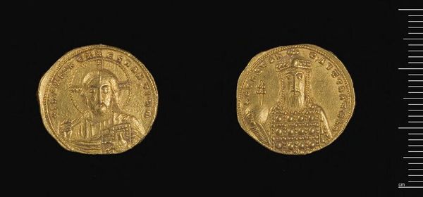 Editor: Here we have a gold coin of Justinian II. What strikes me is the detail achieved on such a small object. What can you tell us about its production? Curator: The coin's gold material and the detailed figuration speak volumes about the Byzantine economy and social hierarchy. How did the process of minting and distribution reinforce Justinian’s power? Editor: So, you're saying the value isn't just monetary, but also symbolic in terms of labor and power? Curator: Precisely. Consider the workers extracting the gold, the artisans creating the die, the officials overseeing production, and how it all contributes to the coin’s inherent value beyond its weight. Editor: I never thought about it that way. It's more than just currency; it’s a record of the entire social and economic structure. Curator: Indeed, and this piece provides a lens for exploring the intricate connection between art, labor, and the assertion of imperial power.