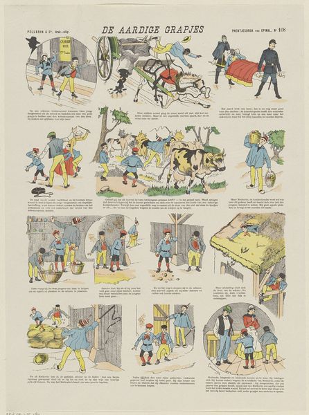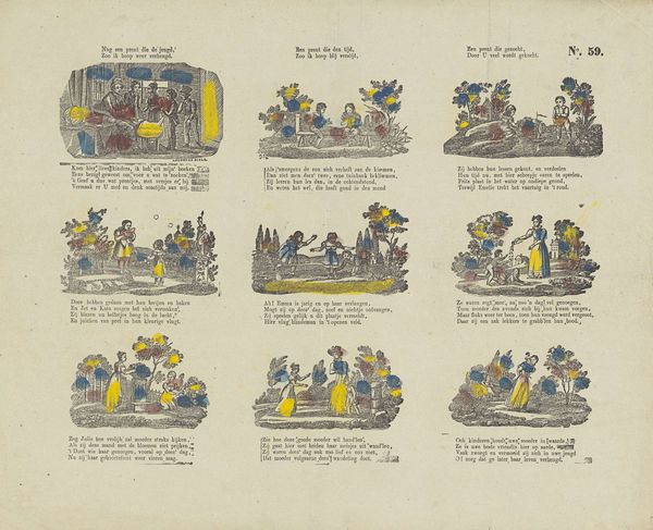 This print by Lutkie & Cranenburg presents four scenes representing the changing seasons, rendered with simplified forms and gentle hues. The composition divides the pictorial space into quadrants, each depicting seasonal activities from plowing fields in spring to gathering fruit in autumn, and the bareness of winter. The artists employ color not to mimic nature, but as a structural element, using soft yellows, blues, and reds to define shapes and delineate figures from the landscape. This selective coloring flattens the perspective, emphasizing the surface quality of the print. The formal choice evokes the era’s interest in breaking from traditional representational modes. The arrangement and style prompt a reading of the seasonal cycle less as a literal depiction and more as a symbolic structure. What we see challenges the illusionistic depth of earlier art forms, and offers a conceptual engagement with time and nature. It reveals a modern sensibility playing with the semiotics of color, form, and space.