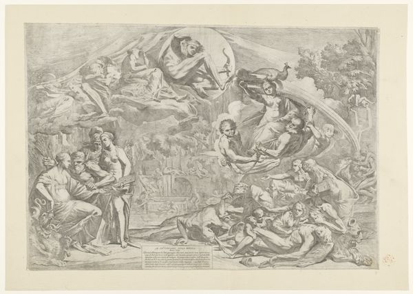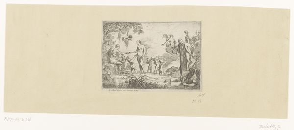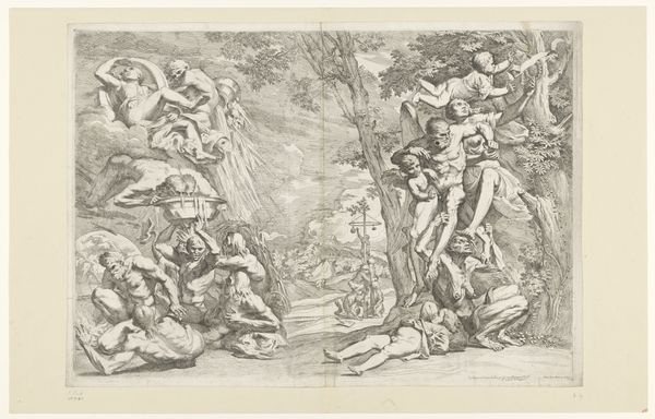 Pierre Brebiette created this etching of The Conversion of Paul, a print, during the first half of the 17th century. The composition is a whirlwind of bodies and divine light, dominated by a central burst of radiance from the heavens. Brebiette masterfully uses line and form to create a dynamic scene. The tightly interwoven figures, caught in moments of shock and awe, are rendered with intense detail. The artist employs a complex interplay of light and shadow, typical of the Baroque period, to heighten the drama. The lines, etched with precision, give shape to the chaotic scene, yet the divine intervention is depicted through softer, more fluid strokes. This contrast between the earthly turmoil and the heavenly light suggests a rupture of fixed meanings, destabilizing the viewer's sense of space and perception. The print challenges established notions of power by portraying a moment of spiritual transformation.