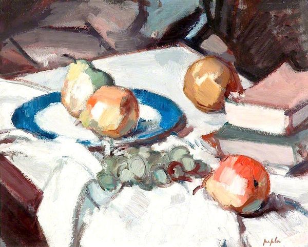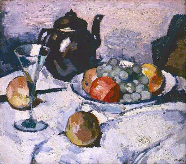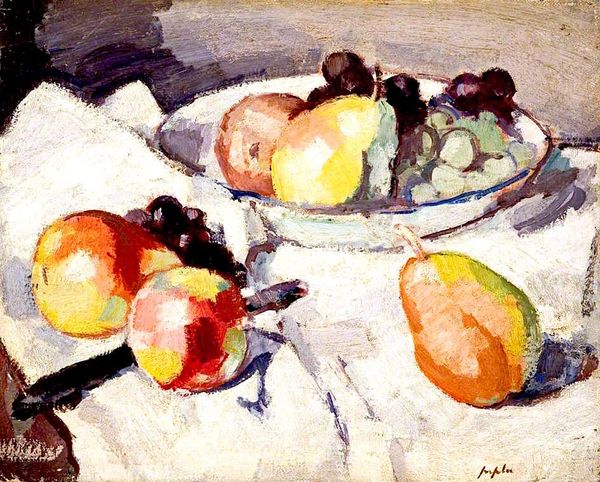 Samuel Peploe made this oil painting, Still Life with Pears and Grapes, in the early 20th century. This was a time when artists were exploring new ways to represent the world, moving away from traditional academic styles. Peploe, a Scottish Colourist, was part of a group that found inspiration in the vibrant colours and bold brushstrokes of French Impressionism. Notice how the thick, visible brushstrokes create texture and capture light. Still life, a genre focused on inanimate objects, provided a safe space for artists to explore these modern ideas about form and colour without making overt social statements. During this period, institutions like art schools and galleries played a crucial role in shaping artistic tastes and providing venues for artists to exhibit their work. Peploe’s art reflects a changing society, one where artists felt freer to experiment with new ways of seeing and representing the world. To understand Peploe's art more deeply, we can consult exhibition catalogs, period art criticism, and biographical studies. These resources help us to understand the artistic and social context in which he worked and how his art fits into the broader history of modernism.