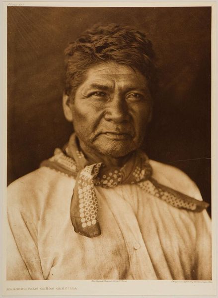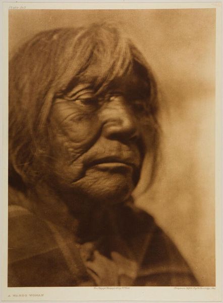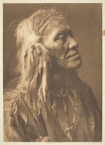 Editor: This is Edward Curtis's photogravure, "A Pyramid Lake Paviotso." The sepia tone and tight framing make it an intense portrait. What do you see in this piece? Curator: Curtis’s photographs were published as objective records, but we must ask, for whom? Were they really objective? Consider the social context: these images were made during a period of intense assimilation policies. Editor: So, the image reinforces a power dynamic? Curator: Exactly. Curtis was, consciously or unconsciously, participating in constructing a specific narrative about Native Americans for a predominantly white audience. It encouraged a certain view. Editor: I see what you mean. It makes me question the photograph’s role. Curator: Indeed. It prompts us to think critically about the power of images and the historical forces that shape them.