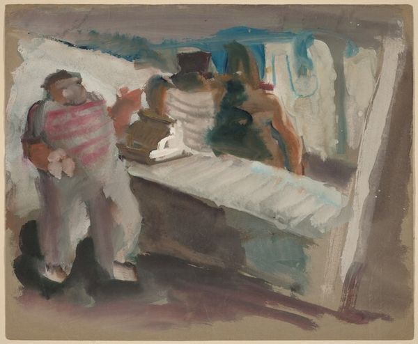 Curator: So here we have Theophilus Brown's *Untitled (Nude with trellis and landscape)* from 1961, rendered in oil paint. Editor: It has a hazy, dreamlike quality to me. It's like glancing at a memory. What elements jump out to you? Curator: It's striking how Brown utilizes such broad, expressive brushstrokes. Look at the way the trellis isn’t just depicted, it's *built* with pigment. And the implied labor in creating that surface—the sheer quantity of paint applied, pushing beyond representation to almost sculptural form—how does that strike you? Editor: I see what you mean. It’s like the paint itself is a raw material being manipulated. Is the process as important as the final image? Curator: Absolutely! Brown pushes the boundaries between traditional easel painting and a kind of tactile construction. It’s a post-war moment, think about the availability of materials, the expanding art market... what’s being consumed? Not just the final ‘art object’ but the very *idea* of art production. How is this different from a typical landscape we’ve seen prior? Editor: It feels… less refined, more immediate. The canvas itself becomes a site of action. Instead of focusing on representing the world, it's calling attention to how it's made. I'm rethinking how to consider artistic labor in art history. Curator: Exactly! We are challenging those hierarchies by recognizing the physicality, the making of it all. I’m taking away with a better grasp on post-war material concerns in art making.