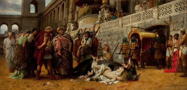 Curator: Alfred Dehodencq's "The Execution of the Jewess (Sol Hachuel)," painted in 1860, depicts a harrowing scene steeped in the orientalist visions of 19th-century France. The composition alone, with its stark contrasts and crowded figures, practically screams historical narrative. Editor: My gut reaction? It’s unsettling. The lighting feels so dramatic, almost theatrical, as though we’re peering into a macabre stage play. The tension is palpable. That young woman's gaze… It's haunting. Curator: It certainly is. Dehodencq situates the viewer right in the midst of this public execution. Sol Hachuel, a Jewish woman executed for alleged apostasy in Morocco, becomes a symbol of religious and cultural conflict in the artist’s rendition. The politics of imagery are clearly at play here. Editor: Politics aside, I'm drawn to the swirling chaos of the crowd. You almost get lost in the faces – the voyeurism, the outrage, the fear… It’s a cacophony of human emotions captured in a single, brutal moment. I think of Goya when I see this, only with more sunshine, ironically. Curator: Indeed. Dehodencq leverages the orientalist genre, but in ways that can both reflect and critique contemporary attitudes towards North Africa. The details in the architectural background hint at an exotic otherness, which was very much in vogue in Europe at the time. Yet, the overt brutality challenges simplistic romanticizing. Editor: See, what hits me is the solitude of the woman. Everyone else is part of this horrible event, caught up in it – even the victim is somewhat connected to them via her plight. Yet, as the subject, the jewess somehow isn't 'present', or belonging, and instead occupies a unique plane. That is what stays in my mind and haunts. Curator: I concur. It is that tension between representation and the complexities of cultural narratives that makes Dehodencq's work so compelling—and controversial. A historical glimpse charged with layered meaning. Editor: Absolutely. It serves as a brutal reminder of how perception and human emotions have shaped how we process our relationship to human violence throughout history. Thanks for bringing this to light, to make me contemplate what really sits behind that stage play.