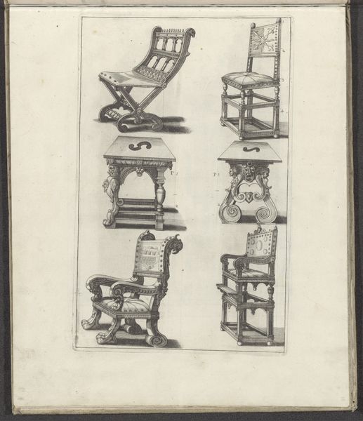 This drawing, whose creator is unknown, presents us with a study of furniture: six chairs and three stools. Notice how the artist uses line to define each object, employing hatching and cross-hatching to suggest form and shadow. The layout is structured, a grid of possibilities almost, presenting a range of designs for domestic seating and surfaces. The pieces, while utilitarian, are imbued with a sense of status through their elaborate carving and ornamentation. We might consider this drawing as an early exploration of design and seriality, where functional objects are elevated through aesthetic consideration. Take note of the variations in style – from the folding chairs with their suggestion of portability to the more fixed and imposing armchairs. The artist challenges the fixed nature of design, suggesting that the function of furniture is not just physical but also symbolic. This drawing then, is not just a catalogue but a proposition about how we ascribe meaning to the objects that populate our lives.