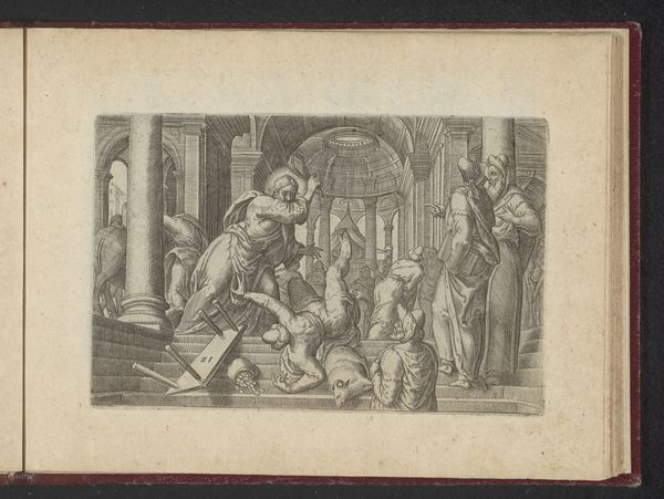 Curator: This is a page from Thesaurus Sacrarum historiarum Veteris et Novi Testamenti, specifically illustrating "The Imprisoned Servant, from The Parable of the Unmerciful Servant." It's an anonymous print from 1585, now held here at The Met. Editor: The scene is stark, undeniably. All the vertical and horizontal lines in the composition form an iron grid of the prison and suggest very little dynamism within the human forms, actually. It feels rigidly medieval, both visually and emotionally. Curator: That emotional resonance is precisely the point. The parable, originating from the Gospel of Matthew, centers on themes of debt, mercy, and ultimately, divine retribution. These prints served a didactic purpose, reinforcing social hierarchies and religious doctrine in an age where access to scripture was limited. Editor: Observe how the artist uses line and shadow to delineate power dynamics. The unforgiving master, positioned on the left, gestures imperiously, directing the abuse. His stance, contrasted with that of the servant—a cluster of bowed heads, bound wrists—creates a focal point on helplessness. Curator: Absolutely. The setting itself – a claustrophobic prison – underscores the societal constraints and lack of agency faced by those in debt. Public humiliation and imprisonment were common punishments; this print, therefore, visually reinforced these realities. The architecture emphasizes a message about social power structures as much as biblical message. Editor: But there’s a peculiar quality to the paper itself. Note the slight discoloration, the way the ink bleeds ever so slightly into the fibres. Does this suggest a homemade quality, maybe even subversion? Curator: Subversion might be too strong a word here. While paper quality could vary depending on availability, it’s more likely a reflection of production standards at the time. Its imperfections humanize it, almost drawing the viewer into its world and ensuring the moral message grips the contemporary audiences all the more powerfully. Editor: I appreciate that insight. Looking at this from my point of view, and stepping back for a second, it strikes me as something of an uncanny precursor to much later works on similar subjects that show a group or class of people exploited, used, subjugated in ways meant to both convey some narrative story, as well as evoke sympathy through compositional relationships. Curator: A lot to absorb from this arresting visual. It is definitely worthwhile seeing this period "imprisoned servant" for yourself. Editor: Indeed; a journey through light, line, and social realities of an era, embedded within this humble book.