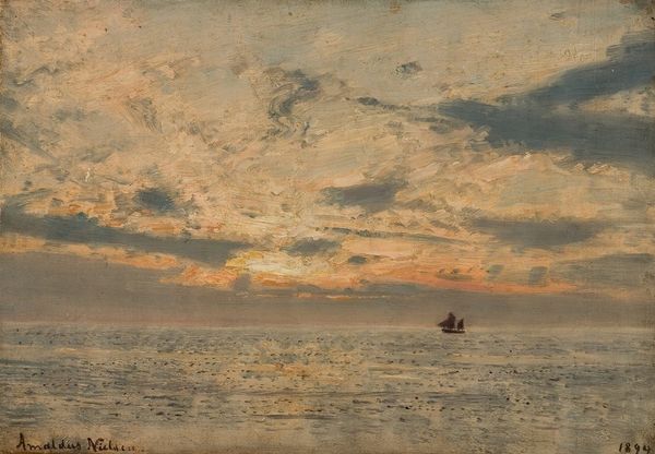 Amaldus Nielsen painted "Solskinnsstemning, Hvaler" in the late 19th or early 20th century using oil on canvas, a fairly conventional choice for the period. The canvas itself provides a subtle texture, grounding the shimmering surface of the water, yet the real story is in the paint itself. Look closely, and you'll notice a remarkable economy of means. Nielsen has built up the image with thin glazes and broad brushstrokes, capturing the reflective quality of the sea at Hvaler. Consider also the sheer labor involved in the production of this image. From the cultivation of flax for the canvas to the grinding of pigments for the oil paint, each step relies on skilled work. Nielsen then transforms these materials through his own learned technique. Ultimately, "Solskinnsstemning, Hvaler" isn't just about a coastal view; it's about the translation of the physical world into material form, and the quiet labor of the artist that makes it possible.