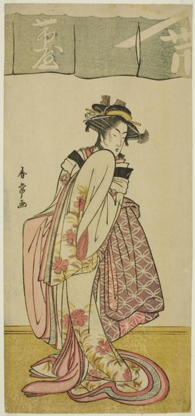Editor: Here we have Katsukawa Shun'ei's "The Dance Interlude (Shosagoto) 'Shinodazuma'" from around 1795, a Japanese woodblock print now at the Art Institute of Chicago. It’s really quite striking. The detail in the woman’s kimono, the patterns and subtle colors...it's incredibly captivating. What strikes you most about this piece? Curator: It’s fascinating how this print captures a pivotal moment in the representation of women within Ukiyo-e. We see a transition. How do societal roles of women at that time influence your interpretation of the subject? Editor: I hadn’t considered the social context specifically. I saw beauty and grace. But if we consider women's roles... Perhaps her slightly downcast gaze speaks to a restricted societal position? Curator: Exactly! Shun'ei, along with other artists, started moving away from idealized depictions to a more grounded portrayal. Notice her clothing: elaborate, but also confining, hinting at the expectations placed upon her as a performer and as a woman within a rigid class structure. How did theater impact gender roles in Japanese society? Editor: That's interesting. So, it’s not *just* a pretty picture. It’s reflective of— and maybe even subtly questioning— social norms? Curator: Precisely. This piece is part of a larger visual dialogue concerning the place of women in public life. Editor: I never would have seen that on my own. I appreciate how understanding the cultural and historical context changes the entire meaning of the work. Curator: And hopefully you are more aware of how powerful public representations can be and what messages were transmitted during the Edo period through such pieces.