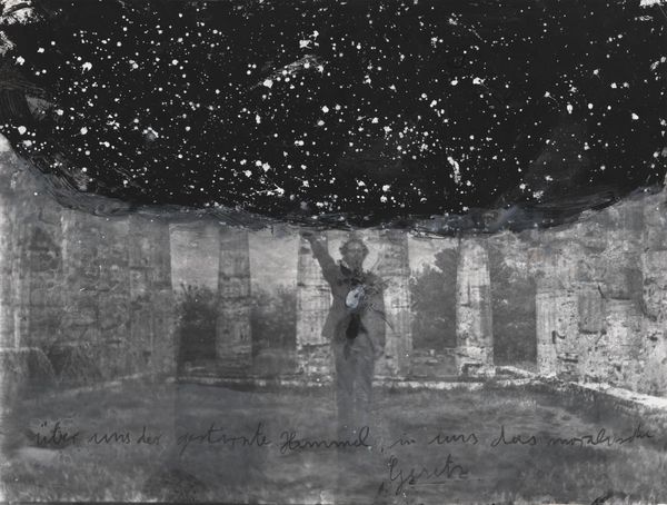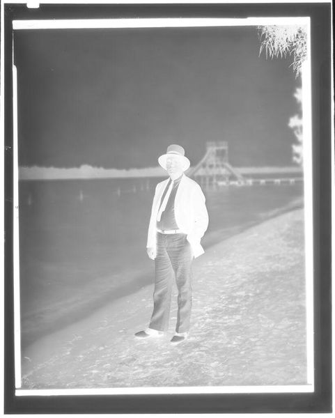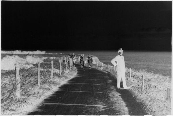Curator: This is a rather enigmatic photograph by Julia Feininger titled "[Lyonel Feininger looking through binoculars on beach, Graal or Rügen, Baltic Coast]." Editor: It feels quite stark. Almost ghostly, with that figure isolated on the beach. The tonal inversions give it a surreal quality. Curator: Yes, she's captured her father, the artist Lyonel Feininger, seemingly lost in observation. What's fascinating to me is thinking about Julia herself, behind the camera. Editor: Right, what was her process? This looks like a photographic negative, which suggests a particular kind of darkroom practice, a material engagement with the image-making. Curator: It’s almost as if we are looking through Julia's eyes at her father looking into the distance; a double layering of observation. He is looking at something, she is looking at him. Editor: Ultimately, it's a family portrait of sorts, mediated through technology and material processes. It speaks to the complex layers of relationships. Curator: Beautifully put. It's a piece that invites us to consider not just what is seen, but who is seeing, and how.