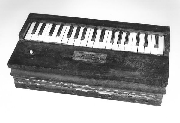 Curator: This intriguing photograph captures a folding harpsichord, an object dating back to the 18th century. It currently resides at the Metropolitan Museum of Art. Editor: Well, it's arresting, isn't it? So austere, so black and white. It looks like a secret weapon from a Jane Austen novel. Is that melodramatic? Sorry. Curator: Not at all. Its austere quality comes partially from the constraints around musical instrument production, even for luxury goods. The socio-political context often regulated materials. Can you see the elegance of its design attempting to overcome functional considerations? Editor: Absolutely! It's an instrument that folds! It's ingenious. One can imagine lugging this along in a carriage… but maybe I'm just lost in a Merchant Ivory film. But what about its baroque characteristics? I do sense something… theatrical here? Curator: The Baroque influence is palpable in the instrument's ornamentation, although perhaps it appears subdued through the photograph, or given the functional innovation of a 'folding' design. At this time, patronage from wealthy families and the church shaped the landscape of art, which impacted instrument building. Editor: Right, right, the patrons... it all trickles down. What a paradox: revolutionary for being compact but restrained by money folks and tradition! Makes a musician kinda revolutionary, don't you think? Defying some grand drawing room where everyone pretends to have the same feelings! Curator: The ability to adapt art to varied circumstances, that is, playing chamber music for your village green, would grant greater public engagement to the fine art practices otherwise locked inside royal courts. Editor: A democratic harpsichord! Well I didn't see that coming. A folding harpsichord designed to avoid social mores--what could be better? Thank you, now I have a clear picture. Curator: Indeed. The instrument exemplifies the interplay between aristocratic display and burgeoning practicality. Its visual elegance reminds us of broader shifts in both art and society during its time.