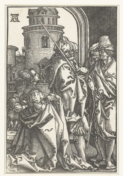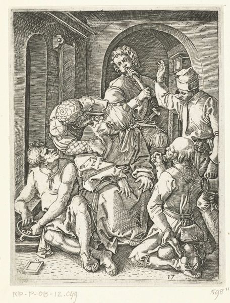 Curator: Today we're looking at "Engraved copies of The Little Passion," prints by Albrecht Durer, dating from 1485 to 1699. They're currently held at the Metropolitan Museum of Art. Editor: This is intense. The dark lines really give it a harsh, almost brutal feeling. There's so much going on in such a small space, and I'm immediately drawn to the figure being presented to the man seated on the throne. What can you tell me about how Durer uses line and form here? Curator: Notice how Dürer's mastery of engraving allows him to create a remarkable sense of depth and texture, even without color. Observe the meticulous cross-hatching. How does this technique contribute to the overall impact of the print? Editor: It creates strong contrast and defines the shapes, adding to that dramatic tension I felt at first glance. Are there ways that the composition draws your eye to a focal point? Curator: Absolutely. Consider the central placement of the figure kneeling, juxtaposed with the imposing figure on the throne. The convergence of lines and gazes emphasizes the power dynamic within the scene, but it's important to acknowledge the spatial flattening, almost compression of space. Why do you think Dürer, or rather his copyist, employs this stylistic device? Editor: I suppose it intensifies the scene, placing us right in the moment. The figures seem crowded and chaotic. Almost claustrophobic! Curator: Precisely. It heightens the emotional impact of the Passion. The rigid lines evoke the emotional austerity of the era, yes? Consider the geometry of suffering expressed in pure, visual terms, and ask what meaning we draw from this. Editor: That’s interesting…seeing the “geometry of suffering.” I hadn't thought about it that way. Curator: These formal qualities enhance the narrative but also exist as self-sufficient entities. What did you get out of viewing these prints with me? Editor: I appreciate understanding how the artistic style is integral to understanding what's portrayed. It helps connect to the work more deeply. Thanks.