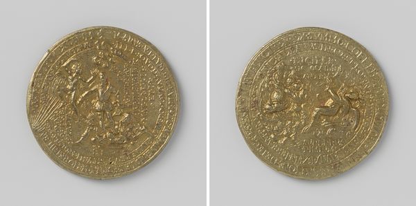 Curator: This piece, a Westfriese gouden rijder, was struck in 1751. Crafted from metal, it presents a fascinating glimpse into the socio-political landscape of its time. Editor: My initial reaction is of grandiosity compacted into a small object. There’s an undeniable power radiating from such a small piece. It feels both intimate and assertive. Curator: Precisely. Its size is deceiving. As currency, its inherent value spoke volumes, but it also acted as a powerful tool of visual propaganda. Note the equestrian figure, a classic symbol of authority, but who exactly is being portrayed? What values are being communicated? Editor: I find myself questioning the narrative embedded within this display of power. The equestrian figure seems inherently linked to patriarchal notions of control and dominance, what other symbolic implications do we need to consider? What is it doing beyond representing financial transaction and value? Curator: We need to also examine its purpose in the visual landscape of 18th-century West Friesland. Coins weren't simply currency; they were miniature billboards, circulating approved imagery and messaging throughout the population. They shaped collective memory and solidified a shared identity. Think about how those visual politics would work within this society. Editor: Exactly, coins became tools, and this tiny portrait would reinforce those socio-political expectations, while perpetuating social hierachies. How did access or control over this object then influence power dynamics within local West Frisian culture? It's interesting that this could be deemed as Baroque as well, despite its size and context, so in what ways are these narratives consistent with other arts from the era? Curator: Its value transcends simple economics or historical documentation; it serves as a crucial artifact through which to analyze power dynamics and the politics of visual culture. This object is an artistic and cultural testament. Editor: Absolutely, seeing art through this lens really opens the door to a far more layered and ultimately fulfilling experience. Thank you for showing me this perspective.