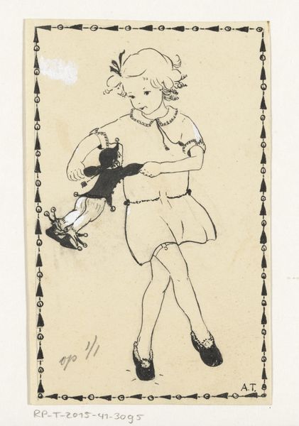 Jony's drawing, "Meisje schrikt van een ballon," captures a scene of childhood surprise and perhaps a hint of societal expectation. Rendered with ink on paper, the artwork presents a young girl startled by a balloon inflated by a boy. The girl's exaggerated expression and posture embody a sense of vulnerability, while the boy, in his suit, seems to represent a kind of playful authority. Reflecting the gender dynamics of its time, the image raises questions about how young girls are socialized to react with fear or surprise, contrasting with the boy's role as the instigator of the action. "Meisje schrikt van een ballon" offers a glimpse into the subtle ways that gender roles are performed and reinforced from a young age, inviting us to reflect on the emotional landscapes of childhood and the societal scripts that shape them.