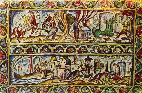 Ahmad Musa painted Rustam killing Istendiyar sometime in the 1300s, using vivid pigments to depict this dramatic scene. The artist would have likely prepared his own colors, grinding minerals and plants to achieve the vibrant blues, reds, and greens we see here. These pigments, carefully applied, create a tapestry-like effect, especially in the densely patterned ground. The painting's surface is relatively flat, characteristic of the manuscript tradition, where detail and narrative clarity were paramount. The focus is on storytelling, rather than illusionistic depth. The labor involved in such a work was significant. From preparing the parchment to mixing the paints and meticulously applying each brushstroke, the creation of this image demanded immense patience and skill. Consider how the artist, likely working within a workshop, contributed to a larger cultural project: the illustration and dissemination of epic tales. Ultimately, the enduring power of this painting resides not only in its narrative but also in its materiality—a testament to the enduring value of skilled handcraft.