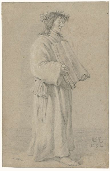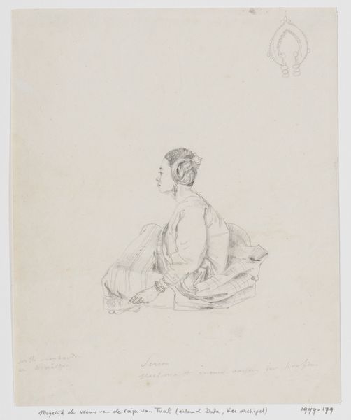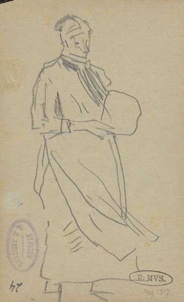 Editor: This is Charles Samuel Keene's "Figure Study," housed at the Tate. It’s a simple graphite drawing, but the subject's upward gaze gives it a sense of hope. What can you tell me about this piece? Curator: Observe how Keene uses line weight and density to suggest form and volume. The deliberate variations in pressure articulate the fall of light and shadow across the drapery. What do you notice about the handling of the figure's face compared to her attire? Editor: The face has fewer lines, more lightly sketched, making it more ethereal. Curator: Precisely. This contrast establishes a visual hierarchy, inviting us to consider the expressive qualities of the figure's pose and the suggestive power of minimal rendering. Editor: I see it now! Thanks.