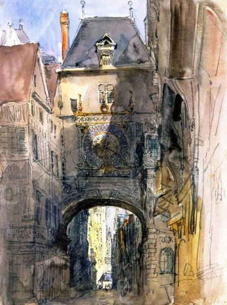 Curator: David Cox painted this watercolor, titled "Porte St. Denis, Paris" in 1829. The Porte, of course, commemorating military victories of Louis XIV. Editor: It feels so airy, doesn't it? Despite the heavy stone of the arch, there’s a lightness in the way he's captured the bustle of the city around it. Makes you almost hear the horses and the chatter. Curator: Cox, of course, belonged to the generation of Romantic artists drawn to both landscape and urban scenes, finding a certain sublime quality in both nature and man's intervention. The arch becomes not just a monument, but a frame for the evolving city behind it. Editor: Frame is exactly the right word. Notice how the street vanishes into the distance through that arch. The whole thing feels a bit dreamy, even, washed in those soft blues and yellows. Romantic indeed, like a memory. Curator: It's interesting how Cox chooses to include the market activity directly in front. In doing so, the concerns of ordinary citizens appear as important, if not more important, than the triumphant sculpture itself. I'm wondering if Cox sought to democratize historical painting. Editor: Perhaps he just wanted a good story to tell. All these folks trying to sell their wares… that wonderful pop of that little red umbrella on the right against that beige palette. You can feel him choosing the pulse of Parisian life over rigid celebration. Curator: Certainly, and there’s a subtle critique embedded there as well, I would argue. The past and its symbols inevitably become absorbed, even subsumed by the commerce and culture of the present. This intersection is crucial to understanding Cox’s engagement with Romanticism in the urban sphere. Editor: It almost feels contemporary… That blending of grand structure and everyday life. Something very immediate about it. Curator: Agreed. The conversation Cox initiates between then and now still reverberates through contemporary art and architectural debate. Editor: Yeah. Makes you want to pull up a chair, haggle for some bread, and watch the city unfold.