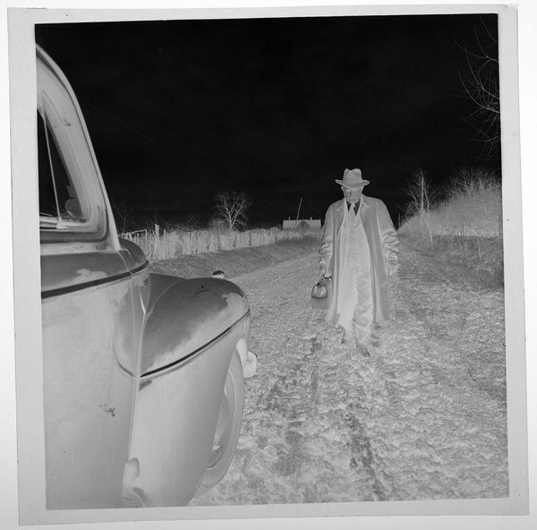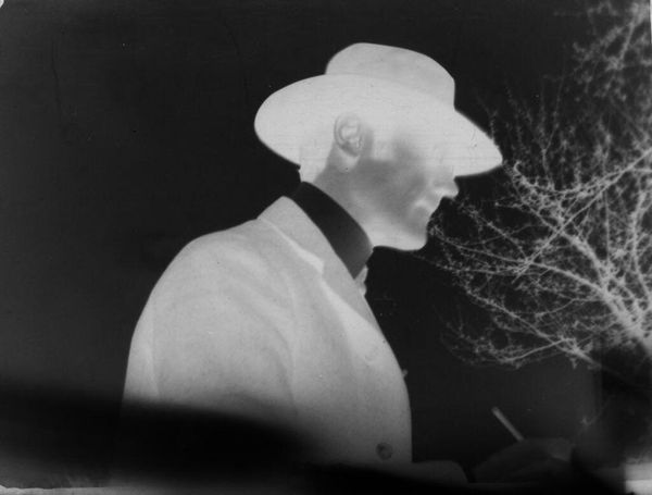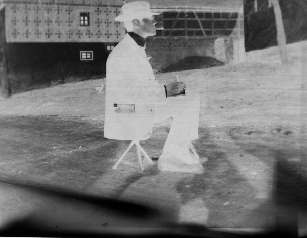 Curator: This photograph, "Lyonel Feininger carrying folding stool, Graal or Rügen, Baltic Coast," was taken by Julia Feininger. It captures her husband in a moment of leisure, possibly on the Baltic Coast. Editor: It’s ethereal, almost ghostly. The high contrast gives him an otherworldly presence against that stark landscape. I wonder what he’s thinking about? Curator: Julia's work here, though undated, offers a unique perspective. Her positioning of Lyonel, with the folding stool, speaks to themes of artistic practice intersecting with domesticity, and the quiet moments in between creation. Editor: Right! Like he's a wandering preacher of modernism. It’s beautiful, but there’s also a sadness to it, a sense of longing in the way he stands alone against the horizon. Curator: I appreciate your reading of that solitude. It resonates with the broader context of artistic identity and the search for place in a rapidly changing world, wouldn't you agree? Editor: Definitely. It’s a reminder that even the most innovative minds need a place to rest their weary bones, and occasionally, a folding stool. Curator: Indeed. It encourages us to question the complex relationship between art, life, and the spaces we inhabit. Editor: Yeah, and how a simple snapshot can hold so much unspoken emotion.
