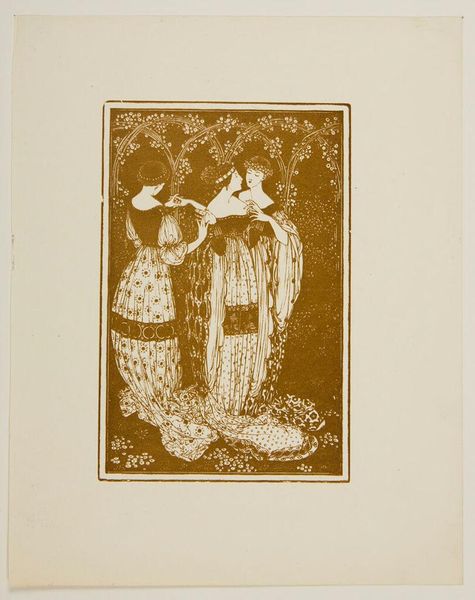 Editor: This is Peter Newell's illustration, "Alice Between Two Sleeping Queens," created for Lewis Carroll’s "Through the Looking-Glass." The whole scene has this dreamlike quality, but the expressions on the queens’ faces are just… strange. What do you see in this piece? Curator: The symbolism here is thick with cultural memory. Sleep, often a metaphor for the subconscious, positions Alice between two figures of authority rendered powerless. Consider how Newell uses the crowns – symbols of power – to frame Alice, almost trapping her between established norms. Editor: So, the queens represent this… oppressive structure? Curator: Perhaps. Or maybe the vulnerability of established power. Newell invites us to question the stability of those structures and Alice's role within them. What does their sleep signify to you? Editor: That’s fascinating. It’s like Newell’s using familiar symbols to show how reality is a little more complex than it seems.