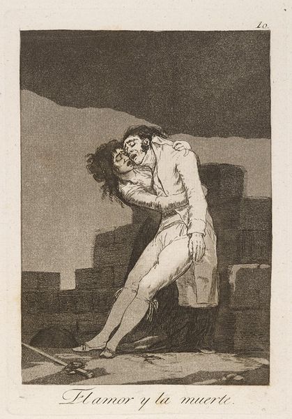 Editor: Here we have Goya’s print, "Love and Death." It’s a stark image, but the etching itself seems delicate. I’m struck by how the medium contrasts with the subject matter. What's your perspective on this piece? Curator: The etching process, using acid to bite into the metal plate, mirrors the corrosive forces at play in the depicted scene. Consider the social context: Goya was working during a time of upheaval. The materials used, from the paper to the ink, speak to the economics of printmaking and its accessibility as a medium for disseminating subversive ideas. Editor: So, the choice of etching itself contributes to the work's meaning? Curator: Precisely. It's not just about the image, but the means of its production and its potential for wider consumption and impact. Seeing it this way, does it shift your understanding? Editor: Definitely, it makes me think about the choices behind the creation, and how the materials communicate just as much as the figures.