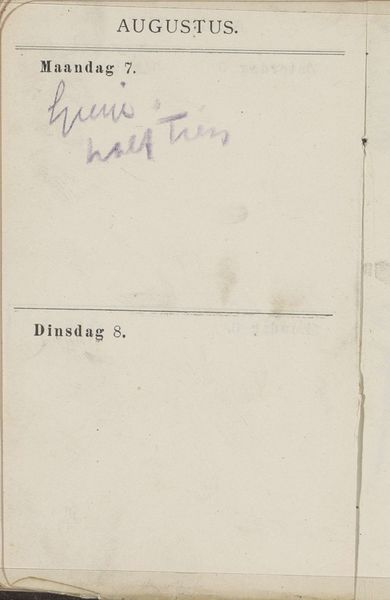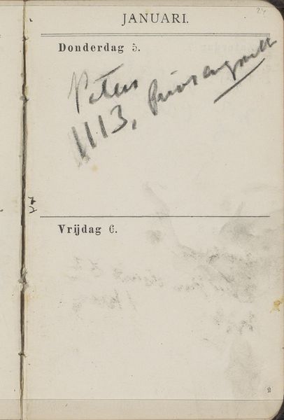 This is a page from a sketchbook, Annotaties, made by George Hendrik Breitner, whose practice captured Amsterdam's street life. The page is defined by its stark geometric structure, sharply divided by horizontal lines into distinct, rectangular sections. The upper segment announces 'SEPTEMBER' and 'Maandag 25', while the inscription 'Dinsdag 26' marks the separation of days. The lower portion is filled with Breitner's handwriting. The contrast between the cold, rigid lines of the printed calendar and the fluid, organic scrawl of Breitner's annotations creates a dynamic tension. In semiotic terms, the printed words function as signs of time, while the handwritten notes are indices of Breitner's thoughts. This piece offers a glimpse into Breitner's artistic process, revealing how he synthesized his observations into tangible forms, which not only documented the era, but also reflected on the artist's individual experience within the urban environment.