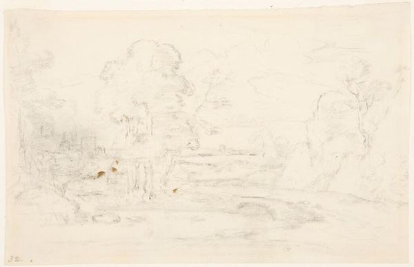 Editor: This is Alexander Cozens' "Rocky Landscape with Volcano", a delicate pencil drawing. It feels so ephemeral, like a half-remembered dream. What's your take on it? Curator: Cozens’ work reflects a burgeoning interest in the sublime and the picturesque. Notice how the volcano, though distant, dominates the composition. How might this appeal to an audience seeking dramatic natural imagery? Editor: I guess it's playing into that fascination with nature's power. It's interesting to think about how this image might have circulated. Curator: Precisely. And consider the market for such images. Was it for personal contemplation, or for wider dissemination, shaping popular ideas about landscape and the natural world? Editor: That really changes how I see it! It's not just a drawing, it's part of a conversation about how we view nature. Curator: Exactly. Art is never created in a vacuum; it’s responding to and shaping cultural narratives.