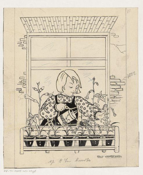 Elly Verstijnen made this illustration, "Meisje met brief aan een tafel," using ink on paper. It's a material and process about as simple as you can get, a deliberate choice that gives the image a charmingly childlike quality. The stark black lines on the bright white paper create a high-contrast scene. Verstijnen's drawing is immediate and direct, with a casual, almost off-hand feel. The ink appears to be applied with a fine brush or pen, giving a clear sense of line. Notice how the use of line defines the forms and textures, like the decorative pattern on the curtains, the basketweave holding bread, and the little girl's hair. This kind of illustration would likely have been made quickly, and perhaps for reproduction in a book. But the artist's decisions about line and composition give it a lively, unpretentious appeal. Verstijnen elevates these basic materials and techniques, bridging the gap between everyday illustration and fine art.