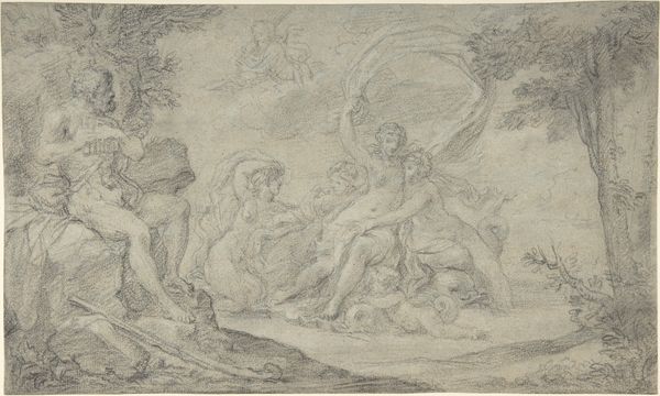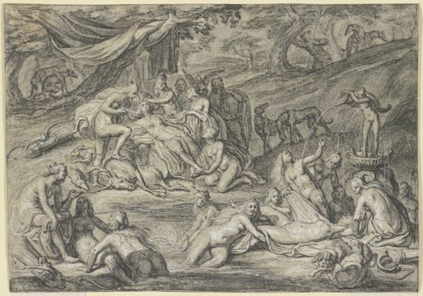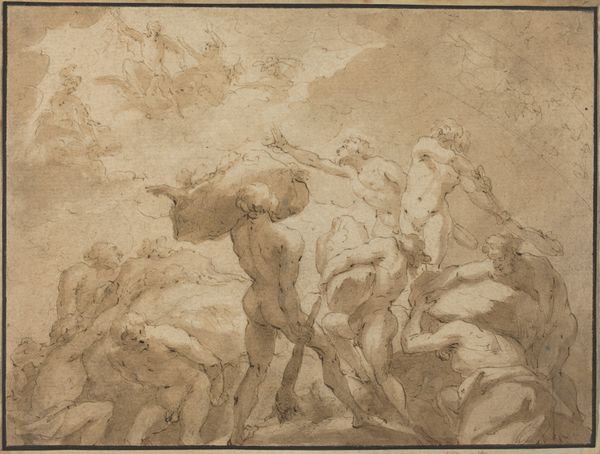 Alessandro Allori's "The Judgment of Paris," is a drawing with pen and brown ink. It presents a scene teeming with figures and nuanced tonal variations. The composition is structured to draw the eye across various groups, from the deities in the clouds to the central judgment scene. The scene's dynamism is achieved through Allori’s manipulation of line and shadow, creating a sense of depth and volume. The artist uses hatching and cross-hatching to build up the forms and create contrast, thereby emphasizing the musculature and drapery of the figures. The careful distribution of light and shade lends a dramatic flair to the mythological narrative. This emphasis on form and anatomical precision reflects the prevailing artistic values during the late Renaissance. Allori challenges us to consider the aesthetic and intellectual underpinnings that guided its creation. The drawing becomes a site where classical ideals meet the sophisticated artistic techniques of the period.