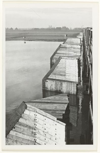 Editor: This is Larry Silver's "Bronx River Dock, NYC," a black and white photograph. The scene feels gritty, industrial. What stands out to you in this piece? Curator: The photograph highlights labor and the infrastructure supporting leisure. Note the weathered wood, the signs advertising "accommodations for ladies," all pointing to a very specific social context. What was the reality of this "joy" being offered? Editor: So you're focusing on the contrast between the promise and the reality of the materials and their context? Curator: Precisely. The photograph encourages us to consider the labor and social structures that enable such leisure activities, and who has access to it. Editor: Thanks, I see the image in a different light now.