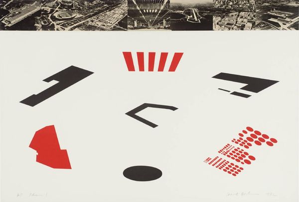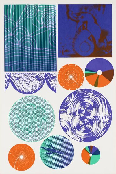 Curator: This untitled print by Eduardo Paolozzi presents a striking arrangement of geometric and representational images. What grabs your attention first? Editor: The collage-like composition is really captivating. I am drawn to the image of Einstein. How does Paolozzi address the intersection of science and culture in this print? Curator: Paolozzi often explored the impact of technology and mass media on society. How might these juxtaposed images comment on the evolving relationship between humanity and scientific progress? Editor: Perhaps it's a commentary on how science is integrated into the everyday, almost mundane, aspects of our lives? Curator: Exactly! The vibrant colors and pop-art aesthetic further emphasize how these themes permeate our visual culture. I think Paolozzi challenges us to question the narratives that shape our understanding of the world. Editor: This piece has given me a lot to consider about art's role in reflecting cultural shifts. Curator: And hopefully, in challenging them too!
