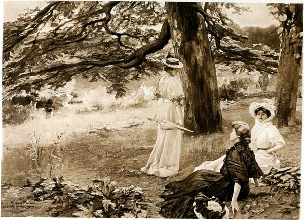 Editor: This is "The Secret Garden" by Charles Robinson, created around 1912 using coloured pencil. It's… melancholic. The colors are muted, and everything feels a little overgrown, a little forgotten. What symbols stand out to you in this drawing? Curator: The most striking thing is the ruined garden itself. Notice how nature has started to reclaim the urns. Consider what a formal garden, especially one with statuary, symbolized in the early 20th century - control, order, the dominance of man over nature. What does its disintegration here signify? Editor: A loss of control, maybe? A world turned upside down? Curator: Perhaps. The figure standing at the top of the steps… do you see a face of longing or sorrow? Is the figure at threshold or about to fully descend? And what is mirrored below? Look at the composition. Robinson deliberately obscures. Consider this against the backdrop of the Arts & Crafts Movement, which often idealized nature. Editor: So, even within this idealized vision, there's this undercurrent of decay, or a commentary about idealized versions. It almost feels like memory… slightly distorted. Curator: Exactly! It is also about memory itself, filtered, selective, and deeply entwined with our personal experiences and emotional states. That reflected face asks, "Can you truly see?" or more personally, "Can I truly see?". Editor: That really changes how I see the whole piece. The garden isn’t just a place; it’s a state of mind, or the manifestation of one. Curator: Yes! The picture creates space for inward reflection and cultural continuity to take place. We see through symbols and art, what we choose to believe in ourselves.