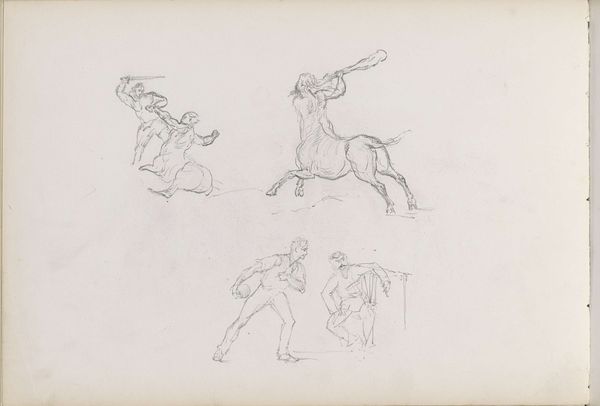 Editor: So, this is "Gevecht tussen een soldaat met een zwaard en twee mannen met een bijl en een pijl en boog," which translates to "Fight between a soldier with a sword and two men with an axe and a bow and arrow." It's a pencil drawing by George Hendrik Breitner from 1873, here at the Rijksmuseum. It feels like a snapshot of a larger narrative, full of tension, but also a bit unfinished. What do you see in this piece, and how does it speak to its time? Curator: It's tempting to view this simply as a historical battle scene, but let’s consider the broader socio-political context of 1873. Post-colonial power dynamics were very tense. Is Breitner depicting a straightforward clash, or is he exploring power imbalances, resistance, and the romanticized visions of conflict that served to justify those power imbalances? Editor: I hadn't thought of it that way. The roughness of the sketch makes it seem less about glorifying war and more about the raw struggle. Could that rawness be a critique? Curator: Precisely. Consider how academic painting traditions of the time often presented idealized, heroic depictions of battle. Breitner, in his sketch-like style, departs from that, doesn't he? Could his deliberate lack of polish be a subtle form of resistance against established norms, a commentary on the dehumanizing aspects of conflict masked by grand narratives? Do you find that reading reflected in other works by Breitner? Editor: I need to explore his other work! This makes me question what I initially perceived as simply a historical scene. I thought I was just looking at an old battle drawing. Curator: And now? Editor: Now I'm wondering whose perspective we are actually seeing and how that perspective impacts the meaning of the scene. Thanks for the historical context!