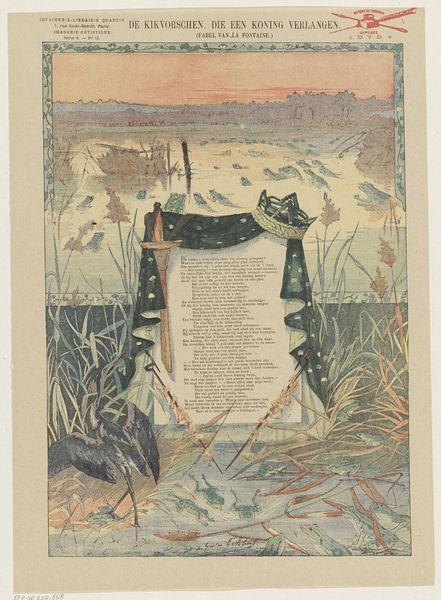 Curator: Firmin Bouisset's "De rat en de oester," created sometime between 1876 and 1890. What springs to mind when you look at it? Editor: Immediately, I’m struck by the odd juxtaposition of the romantic sunset scene on one side and the very domestic narrative unfolding next to it—like two entirely different lithographs clumsily mashed together. Curator: I think that is actually very astute. It is created with mixed-media – you’ve got the printmaking right next to what seems to be watercolour illustration, probably aged and toned paper underneath too. Editor: Which just highlights its existence as an object made with human labour, right? We're seeing evidence of printing processes, manipulation of paper and watercolor. How often do we really consider the intense making that goes into this kind of visual narrative, presented in the service of education perhaps? Curator: I wonder... look how much is devoted to that glorious bleed of watercolor on the bottom. I almost miss that it depicts a rat with an oyster at first because the colours of sunset is almost magical. It's very dreamy, right up until you register the poem and its rather mundane storytelling right above it. Editor: Right! I'm suddenly imagining the hands of the people involved in making and distributing such an image to its potential consumers, who are also laboring. I guess, these images made by Bouisset probably became incredibly commonplace, adorning pages in books. So you have a question: for whom are such pretty illustrations and highbrow stories intended anyway? I see the echoes of labor everywhere in it. Curator: The juxtaposition creates an unexpected visual harmony. It's a simple artwork of fable combined with this gorgeous sunset. You wonder who thought about joining these separate pieces, like how this image ended up being a story about wealth that features so much working process in order to tell the story. It is funny, if not tragic. Editor: It makes you appreciate what labour produces -- not only artistic vision but tangible output too! Something we easily lose sight of! It certainly highlights art's relationship to its social setting. Curator: So true! Bouisset creates not only image or artwork but gives light of a small social class during his time as well.