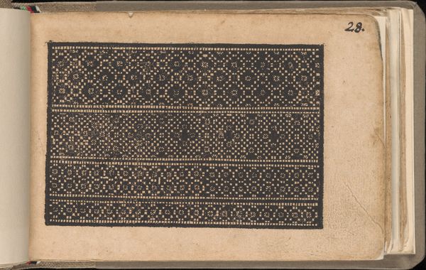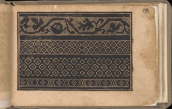Curator: Welcome. Today, we're observing a page from Sigismundus Latomus’s "Schön newes Modelbuch," dating back to 1608. This particular page, designated 24r, is a woodcut, now held at The Metropolitan Museum of Art. Editor: It has this stark, almost oppressive quality. All that tightly packed detail within a strict grid, like peering through an elaborate screen or a densely woven fabric sample. The effect is strangely claustrophobic. Curator: The essence lies in its ornament, doesn't it? Consider the print’s texture and density – it provides us visual information and instruction about period pattern and technique, the way it merges art and craft. Editor: And craft so intricately tied to women's work of the period – embroidery, lace-making. This wasn't just decoration; it was a visual language, a marker of status, skill, and even identity, particularly for women navigating social expectations and limitations in the domestic sphere. Curator: Indeed, these books were instrumental in disseminating design and pattern across Europe. Semiotically, you see an intentional combination of visual vocabulary which acted almost as a codex or trade lexicon across makers and customers of finery. Editor: Right. Each motif possibly holding cultural or social symbolism relevant to the book's readers, its users, the makers who turned abstract designs into tactile realities, imbued it with meaning in the process of creation. Curator: Looking closely, notice the meticulous carving. The Northern Renaissance valued intricate detailing; observe the visual harmony in the composition. The interplay between the positive and negative spaces creates an almost palpable texture, regardless of scale. Editor: Precisely. The fact that these patterns served a practical, vocational function within very structured societal parameters is hard to ignore. They simultaneously reveal and conceal complex narratives of gender and labor. Curator: A balanced perspective allows for a deeper encounter with the art, even a print. It embodies form and culture in dynamic equilibrium. Editor: Right, hopefully enabling new modes of investigation.