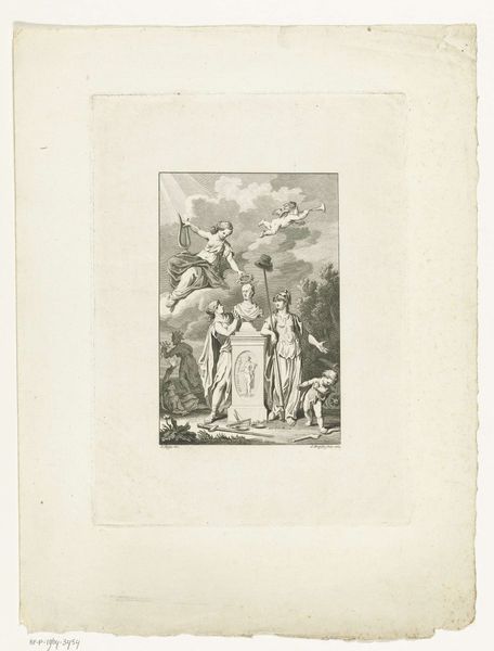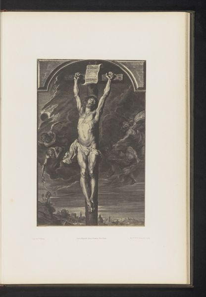 Editor: This is a photographic reproduction of Paolo Veronese's "The Crucifixion," made before 1875. Even in monochrome, the drama is evident. It feels monumental despite the smaller scale of the print. What do you see in this piece? Curator: The cross. Not just the object itself, but the profound symbol it has become. Here, we witness a crystallization of centuries of faith and cultural memory. Notice how the figures at the base cluster, mirroring the shape of the cross while simultaneously expressing human grief. Do you see any symbolism in their postures? Editor: Perhaps their closeness represents comfort amidst suffering, like a visual echo of unity in despair? Curator: Precisely. The composition directs our gaze upwards to the central figure and the instruments of death—yet even there, subtle cues lead us back down, anchoring us to human empathy. Veronese’s original composition served as a visual catechism, layering theological significance onto observable reality. The figures, the light, all point toward divine tragedy. But in the symbolism, there’s resilience, too. Editor: That connection between the human and divine...I hadn't considered how actively the composition works to reinforce it. Curator: The image’s symbolic power has persisted, precisely because it transcends mere historical record; it touches upon universal themes of sacrifice, suffering, and hope. Reproductions like these aided in the widespread dissemination of religious iconography, and played a key role in the codification of visual representations of biblical stories. They served to remind all the beholders the cultural narrative which has defined Europe for centuries. Editor: I'll certainly look at religious paintings differently now, understanding better the symbols at play and the powerful impact across cultures and generations. Curator: Indeed, understanding how these images functioned historically enhances our contemporary engagement.