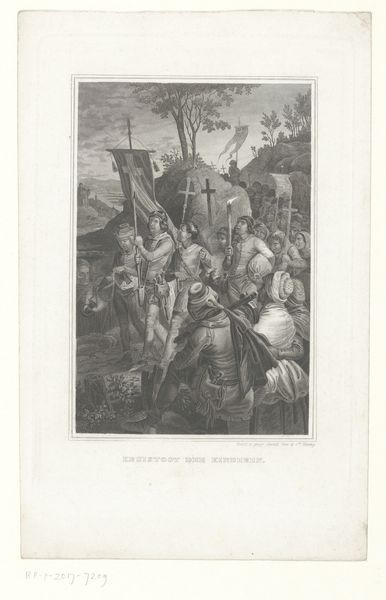 François van Bleyswijck created this engraving titled "Soldaten hakken duimen en grote tenen van Adonibezek af" – or “Soldiers cutting off the thumbs and great toes of Adonibezek” - sometime between the late 17th and early 18th century. The scene is dominated by a brutal act, meticulously rendered in stark black and white. Van Bleyswijck uses precise lines to depict the soldiers and their victim, emphasizing the tension and horror of the moment. The composition is carefully structured, drawing the eye to the center where the act of dismemberment takes place. The surrounding figures and the detailed landscape add depth and context to the scene, creating a narrative tableau. The print is not just a representation of physical violence, but also an exploration of power and morality. Van Bleyswijck challenges viewers to confront the consequences of conflict. Through formal elements, the engraving creates a semiotic system of symbols and codes, inviting ongoing interpretation and reflection on the darker aspects of human history.