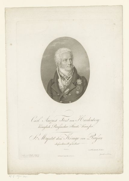 Editor: Here we have Lazarus Gottlieb Sichling's "Portrait of Frederick the Great," an engraving somewhere between 1822 and 1863. The precision of the lines is striking, almost photographic, yet the limited tonal range gives it an austere feel. What compositional choices stand out to you? Curator: The immediate element that draws the eye is the figure's placement. Sichling consciously employed a centered composition. The tight framing further concentrates visual information, isolating the figure from any contextual background, compelling us to scrutinize form and line. Note the artist's decision to vignette the figure; it avoids the hard edges of the substrate. This creates a visual paradox - the softness of the vignette contrasts the rigid detail of the engraving. The light areas create depth, while darkness outlines contours of his figure. Editor: I hadn't thought of that contrast, between the softness and sharpness, before. It’s all about the internal elements then? The arrangement, lines and contrast of texture? Curator: Precisely. We consider the internal structure and organization that generates aesthetic experience. Every component plays a crucial part within the visual experience. The tension created between line, tone, and framing, shapes our understanding and generates the impact of this image. What did you initially observe? Editor: Initially I missed some nuances in this "Portret van Frederik de Grote", I realize now that seeing through form, light, line, is central. Thanks for the pointers! Curator: Indeed. Art offers inexhaustible interpretations; and looking closely gives endless rewards.