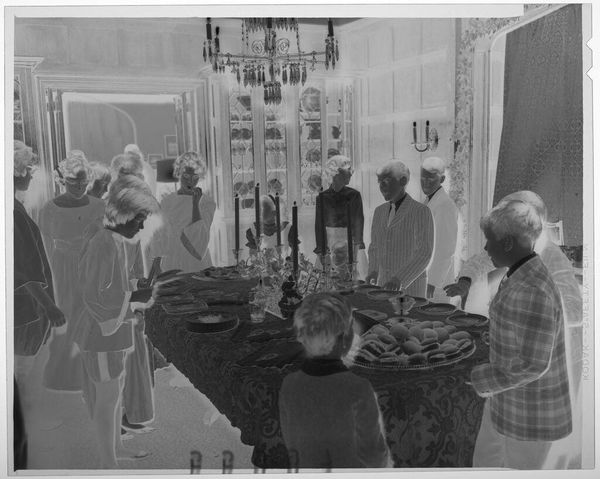 Editor: This interesting photograph, "Untitled (Christmas Party Bar)" by John Deusing, captures a lively scene. The stark contrast makes it feel almost dreamlike, a fleeting memory. What symbols or hidden meanings do you see in this image? Curator: The bar itself is a potent symbol. Throughout history, gathering places—taverns, coffee houses, bars—have served as crucibles for social exchange, often mirroring the anxieties and aspirations of a community. Note the ambiguity, is it celebration, or something else? Editor: So, the bar isn't just a place to drink, but a reflection of society? Curator: Precisely! Consider the collective consciousness at play here, the shared experience of a 'Christmas Party'. Is there something subversive, or is it really just the photographic negative creating a somewhat unsettling impression? Editor: I hadn't thought about the unease it evokes. Thanks for pointing that out. Curator: The image leaves us questioning familiar symbols, and that in itself is revealing.