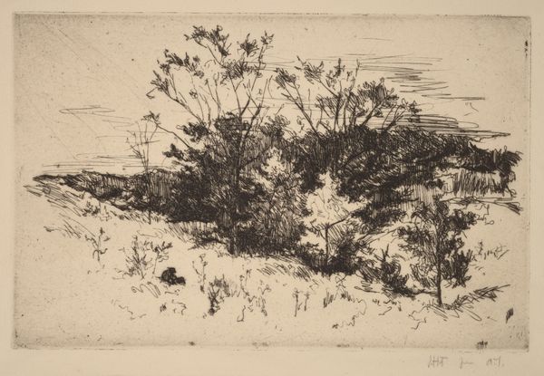 Carel Nicolaas Storm van 's-Gravesande created this etching titled "Eikenbomen in de duinen." The print presents a landscape of subdued tones. The composition is dominated by the diagonal sweep of a dune, grounding the eye before it rises to meet the sparse trees at the horizon. The artist’s focus on line and texture, achieved through delicate etching, gives form to the trees and dune grass. The scene is structured around a central tension between the solidity of the earth and the airy lightness of the sky. The landscape challenges our conventional understanding of nature as static and immutable. The rough texture and the absence of strong tonal contrasts suggest a world in flux. The artist isn't just representing a scene; he's exploring how we perceive space and form, using a semiotic approach to the signs within the landscape.