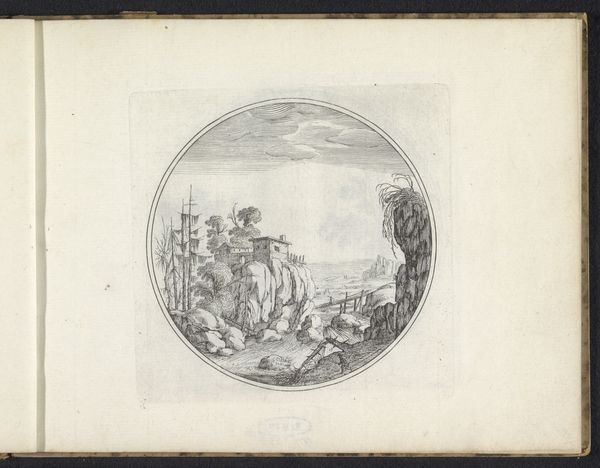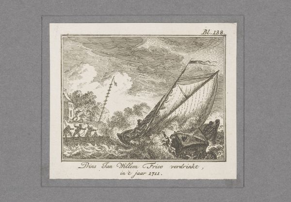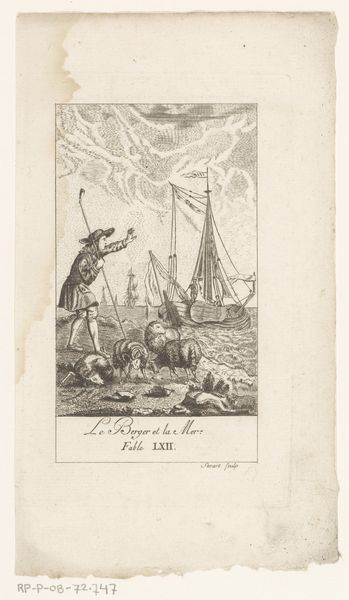 Editor: This is Johann Heinrich Meil's 1758 engraving, "Fable of the Floating Sticks." The scene feels turbulent; there's a storm brewing at sea. I’m intrigued by the postures of the figures on the wooden structure—they seem very focused on something. What's your take on what's happening here? Curator: Well, this piece strikes me as an invitation to reflect on human ambition against the forces of nature, doesn't it? It makes you wonder: what are they *really* looking for? Perhaps opportunity, perhaps something they lost...or maybe just trouble, wouldn't you agree? Editor: Trouble indeed! The waves certainly look ominous, ready to swallow up whatever they're after. I didn’t really consider it a fable at first glance, but thinking about the men versus nature and their focused attention makes me consider their interaction in the piece as more significant. Curator: Exactly! And consider the artistic elements too—the stark lines of the engraving lend a certain drama, don't they? You know, sometimes, art whispers rather than shouts, and I find this engraving speaks in such tones, encouraging a contemplative mood and revealing different meanings on closer viewings. Does the Baroque landscape affect the figures? Editor: Absolutely. I can really see the dynamic movement now! Thinking about art not always having an in-your-face message makes me appreciate the subtleties and invites more thought on a viewing. Curator: That’s the beauty of it, isn't it? Art like this becomes a mirror, reflecting our own questions back at us. And maybe that's the point—to provoke thought and personal reflections. Editor: I'm definitely leaving with more questions and an expanded understanding. Thanks!