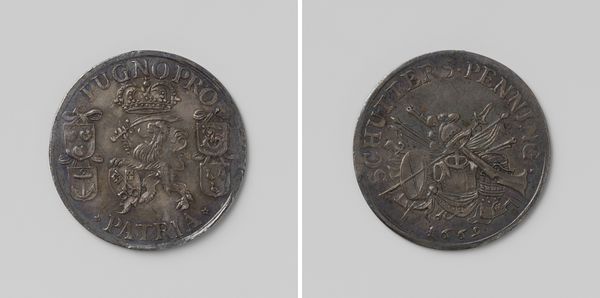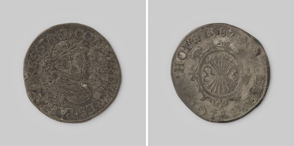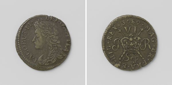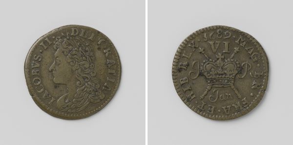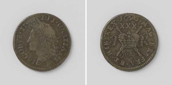 Curator: Let's examine this "Halve crown, noodmunt van Jacobus II, koning van Engeland, uit mei 1690," dating between 1690 and 1695. This piece, residing here at the Rijksmuseum, offers a fascinating glimpse into history through numismatics. Editor: It appears quite austere, wouldn't you say? The scale is rather intimate, but there is a palpable tension in its composition. Curator: Indeed. Focus first on the incised lines forming Jacobus' portrait, see how they create a sense of depth and contour, almost sculpting light and shadow across his face. Notice the laurel leaves in his hair; there is the careful arrangement of text circling him too, its function ornamental as much as informative. Editor: Right, portraits on coins usually evoke a sense of power, but there is something distinctly melancholy in Jacobus’ gaze here. He has a distant, weary expression as if burdened by the weight of the crown. And speaking of the crown, the symbols employed are quite telling. Look at the three crosses depicted just above the stylized crown on the other side, suggesting divine endorsement and a sort of trinity within its representation of rule. But something feels... unstable. Curator: Ah, you astutely notice. It is tempting to suggest the composition echoes this instability too: that the portrait on one side and the crown and emblems on the reverse exist within a field of very simple circular borders that nonetheless constrains them within the metal that constitutes it. This sets off interesting compositional tension and rhythm that guides the eye through the different features of the coin, leading us back always to that rather somber royal visage. Editor: Precisely, and it makes sense given its history as "noodmunt," an emergency coinage. These coins acted as symbols of resilience in uncertain times, or as a means for projecting some stability where little existed. Each visual choice serves this narrative; a material object laden with multiple layers of intent. Curator: I concur. Its aesthetic features alone demonstrate how even small objects encapsulate considerable symbolic import. Editor: The combination of iconographic intent, political and symbolic messaging certainly creates a remarkable artwork for sure.