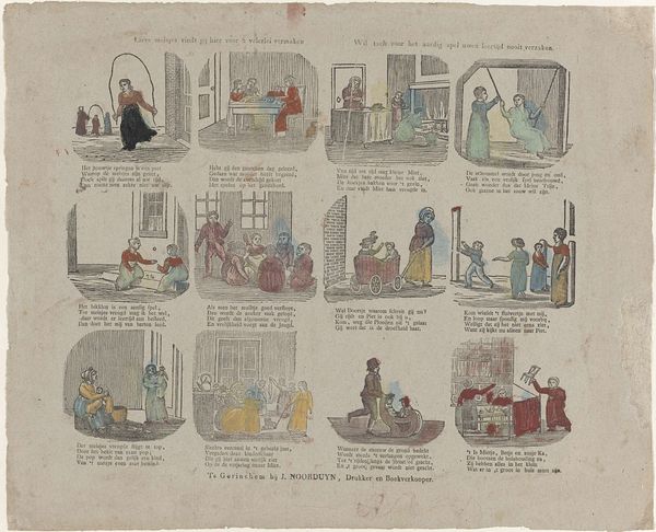 This undated print, "Verschillende taferelen," by Schalekamp & Van de Grampel, presents a collection of miniature scenes, each a snapshot of daily life rendered with delicate lines and subtle color washes. The overall structure is organised into a grid, this compositional choice is not merely decorative; it signifies an attempt to systematically categorise and present various aspects of human experience. Each scene, though small, is meticulously detailed, suggesting an underlying desire to capture the essence of each moment. The restricted palette, dominated by muted earth tones and soft blues, adds to the print's contemplative mood. The artists are not just depicting scenes but are also engaged in the process of meaning-making through structure. The grid is not a restrictive frame but a stage upon which the artists explore the nuances of ordinary life, inviting us to reflect on the significance of these everyday moments.