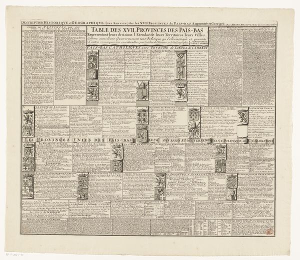Editor: So, this is Abraham Allard's "Afstandstabel voor belangrijke steden uit de Zeventien Provinciën en prinsbisdom Luik tot aan Parijs," dating from 1686 to 1725, a print on paper. It looks like an elaborate chart. What's your take on what it represents and why it was created? Curator: It's a fascinating piece that speaks volumes about the economic and political landscape of the Dutch Golden Age. These distance tables weren’t merely geographical tools; they were instruments of power and commerce. Consider how trade guilds and emerging nation-states needed to efficiently manage logistics, taxation and even military deployment. The visual presentation itself–organized with geometric precision – reflects the Dutch Republic's obsession with order, rationality and control of information, wouldn’t you agree? Editor: That's a very different way to see it. I thought it was more about exploration and way-finding. Are you saying it's more about bureaucratic control? Curator: Absolutely. Think about the role of maps in establishing territorial claims and projecting influence. These ‘distance tables’ would have circulated among merchants, diplomats, and administrators as essential guides that visually assert authority and reinforce commercial ties to Paris. It invites us to critically question who held this knowledge and for what ends? Editor: So, it’s not just a chart; it's a statement about power and the control of information within the political system. I'd never have considered it in that context. Curator: Precisely. By viewing it within its historical setting, it transforms from a simple table into an active artifact shaping political and economic interactions of its era. Editor: That's incredibly insightful. I see it now! Thank you for expanding my perspective. Curator: My pleasure. It highlights how much context shapes our interpretation of even seemingly straightforward visual data.