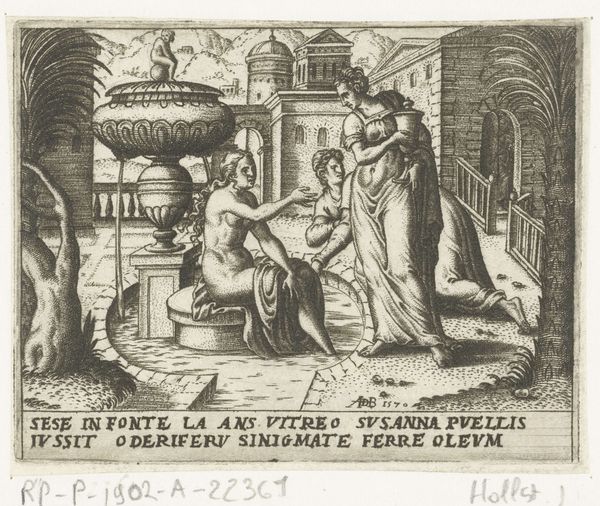 This engraving, *Bruid in gesprek met Godsvrucht*, or Bride in Discussion with Piety, was created by Wierix around the turn of the 17th century. This piece invites us to reflect on the cultural and religious expectations placed on women during the early modern period. Here, we see a bride in conversation with piety, a representation of religious devotion. The bride, adorned and central, is approached by a figure symbolizing chastity, who carries a bundle of sticks and a lock for the door, representing the constraints placed on women. This juxtaposition explores the tension between the earthly desires of marriage and the spiritual calling of piety. The artist uses the female form to convey complex moral and ethical concepts. The bride's pose and expression invite us to consider the emotional and psychological dimensions of these expectations. Does she embrace or resist the path laid out for her? The Latin inscriptions underscore the didactic nature of the artwork, meant to instruct viewers on the virtues of chastity and devotion. Through its allegorical language, the engraving challenges us to confront the historical and ongoing negotiation of women's roles in society.
