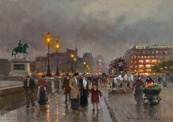 Editor: So this is Konstantin Korovin's "Vichy" painted in 1926 using oil paint, possibly en plein air. It’s really evocative – all these dabs of light making the whole scene shimmer. How do you read this cityscape in terms of its historical context? Curator: Well, consider that Korovin, though Russian, painted this in France after the Revolution. The vibrancy he captures… is it genuine celebration or perhaps a nostalgic yearning for a pre-revolutionary Russia seen through the lens of a European ideal? The city, bathed in light, becomes a stage, almost a distraction from the anxieties of exile. Does the superficiality of the light belie a deeper uncertainty, a questioning of belonging? Editor: That’s fascinating. It’s almost as if he’s painting a feeling more than a place. But the Impressionistic style seems to suggest spontaneity, an immediate capturing of a moment. Curator: Exactly! But who gets to capture and represent "the moment?" The gaze isn’t neutral. Korovin is positioning himself and his viewer within a very specific cultural milieu, one that’s inherently privileged, perhaps even deliberately escapist given the artist’s personal circumstances. Editor: So, by painting this bustling French street scene, he's perhaps constructing a new identity for himself? Curator: Or perhaps trying to hold onto an older one by refashioning it within this new setting. This is post-war Europe, after all, when traditional hierarchies were upended and artists sought to redefine their relationship to society. Is he celebrating a newfound freedom, or mourning a lost world? Editor: I hadn't considered how much the historical context shapes even an impressionistic, seemingly simple, cityscape. It adds so many layers to the painting. Curator: Precisely! It shows how artworks function as both mirrors and agents within specific cultural dialogues. They reflect a moment, but also shape its memory.